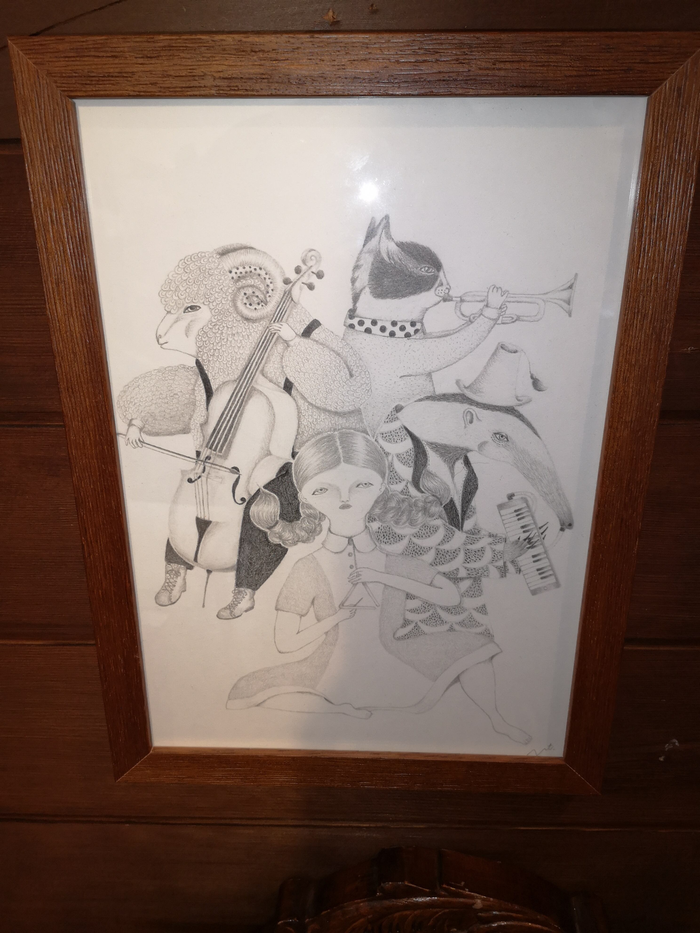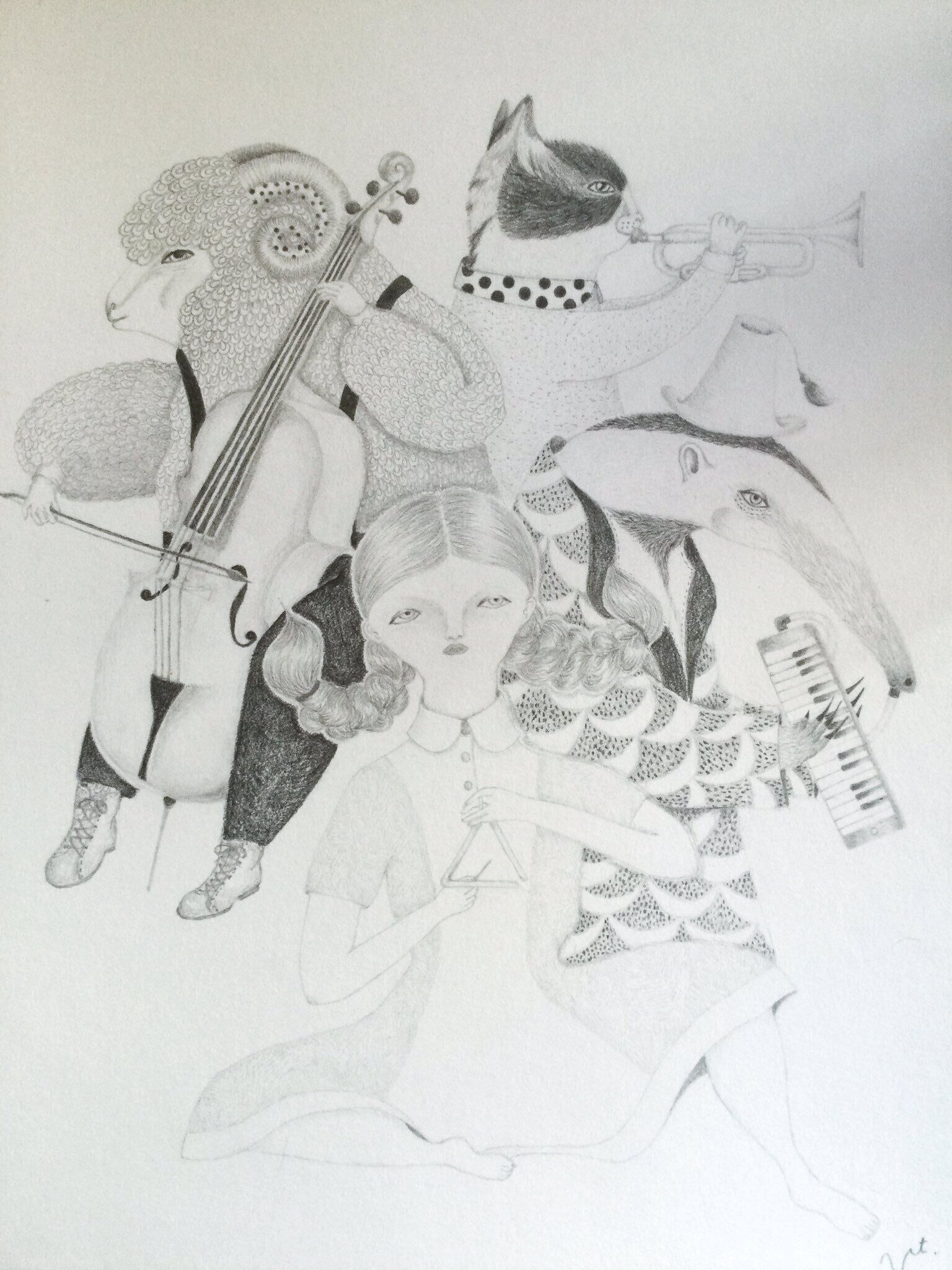 ユニークなアリクイや羊、猫に少女の楽団が描かれています。