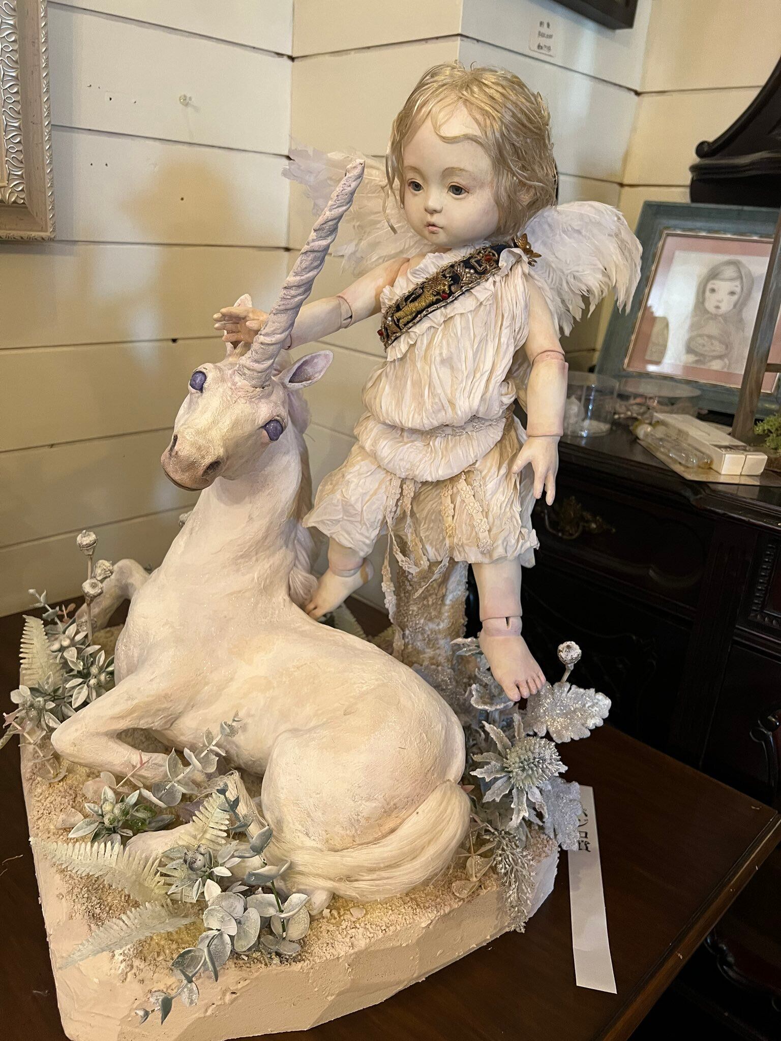 空猫「光射す白き森」球体関節人形、天使とユニコーン