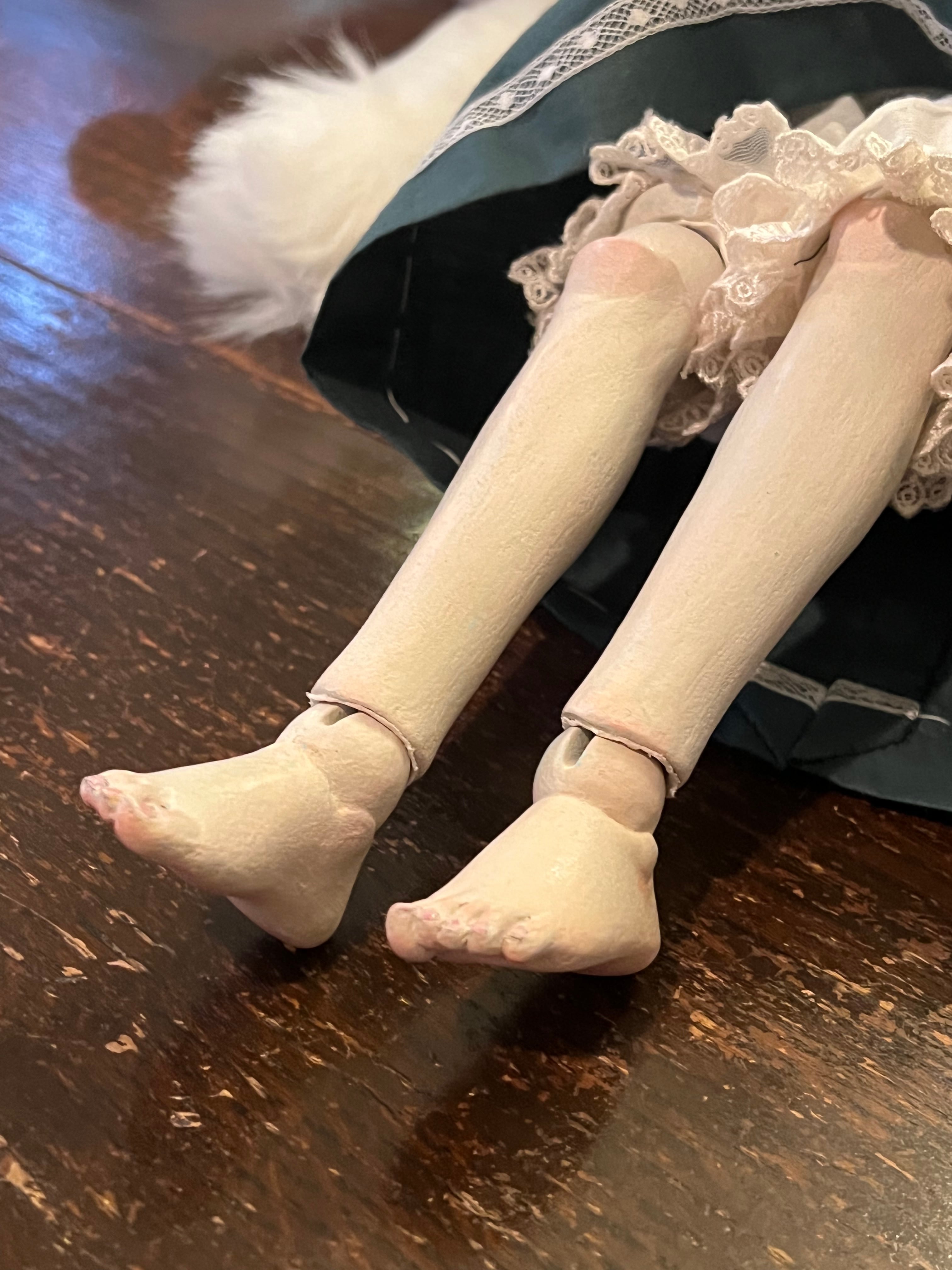 緑色のドレスに、白のドロワーズが覗く、貴族の女の子のようなお洋服を身につけています。